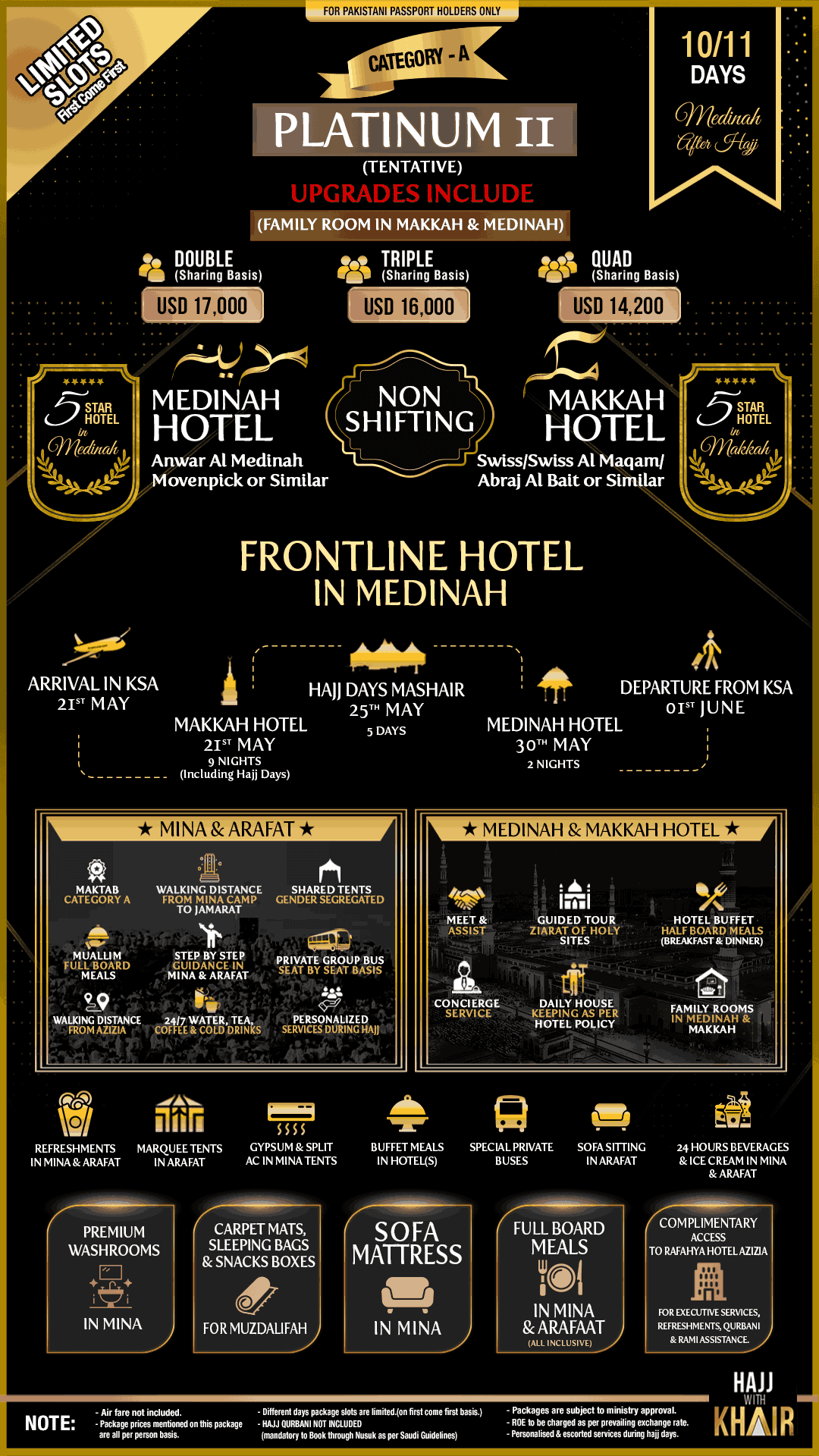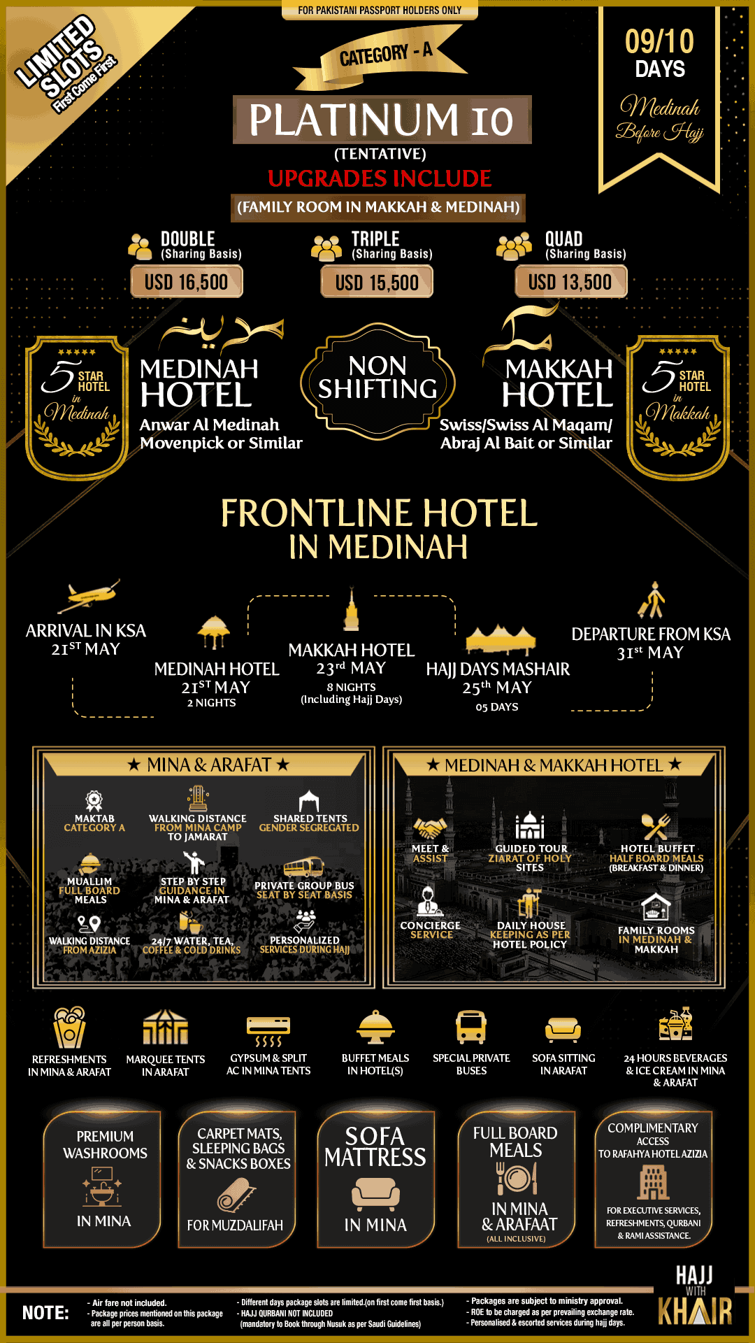 Al-Khair Platinum 10 Package is meticulously designed to offer a seamless, spiritually enriching pilgrimage experience. With unwavering dedication, our team manages every detail, allowing you to focus on the profound sanctity of Hajj. Stay in premium accommodations at top-tier hotels near the holy sites in Makkah and Madinah, ensuring unparalleled convenience and luxury. In Mina and Arafat, our gender-segregated tents provide a peaceful and secure environment with easy access to key rituals. Relish inclusive dining options, carefully crafted to sustain you during your spiritual journey, and immerse yourself in guided Ziarat tours that bring the holy landmarks to life. Throughout your pilgrimage, our team provides personalized assistance and round-the-clock support, ensuring every aspect of your journey is managed with care and professionalism. With Al-Khair, you can embark on this sacred journey with peace of mind, knowing that all logistics are seamlessly handled. Slots are limited, so reserve your place today.