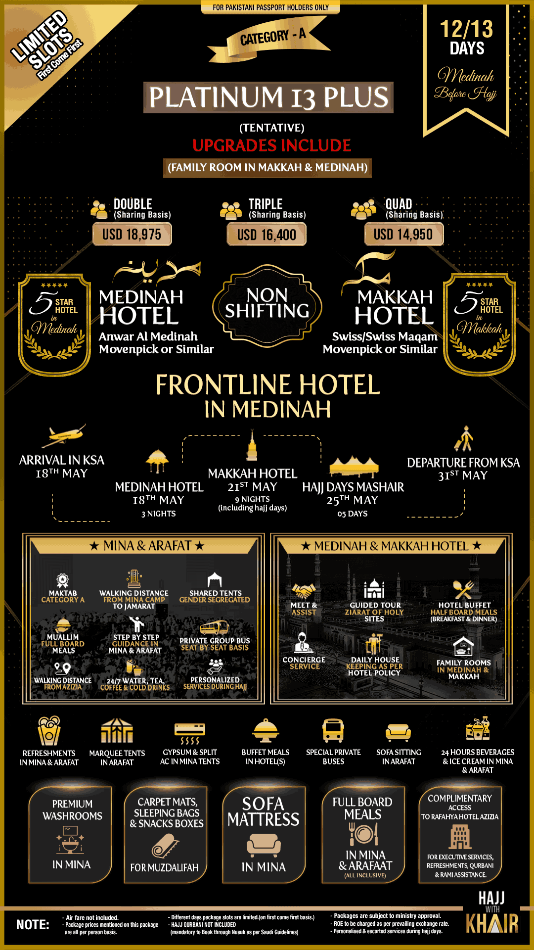 For those seeking a premium Hajj experience, Al-Khair Platinum 13 Pro Hajj Package 2025 offers top-tier services, luxury accommodations, and expertly managed logistics, ensuring a truly transformative journey of faith. Stay in 5-star hotels in Makkah and Madinah, offering unparalleled comfort and convenience with close proximity to the holy sites. During the key days of Hajj, rest in fully air-conditioned, gender-segregated tents in Mina and Arafat, designed to provide a peaceful and secure environment for worship. Enjoy VIP transportation, guided rituals by experienced scholars, and 24/7 dedicated assistance to ensure a seamless and stress-free pilgrimage. Our carefully curated buffet meals cater to your nutritional needs, keeping you energized throughout your journey. Additionally, benefit from exclusive guided Ziarat tours, offering deep spiritual insights into significant religious landmarks. At Al-Khair, we leave no detail overlooked, allowing you to focus entirely on your spiritual devotion while we handle the rest. Last few slots remaining – Secure your Platinum 13 Pro Hajj Package today!
