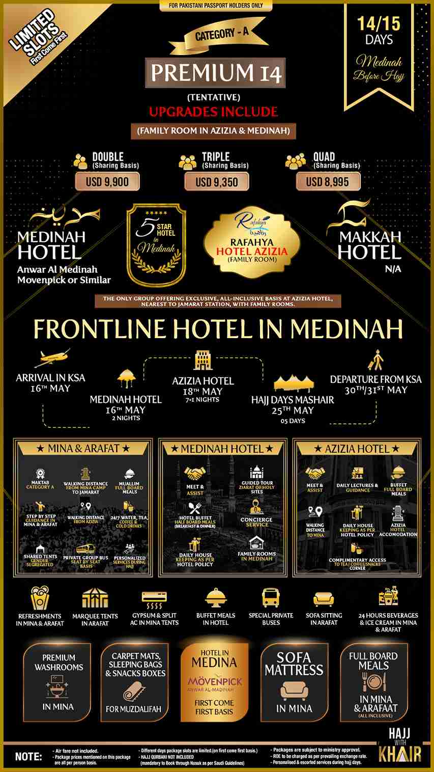 Al-Khair Premium 14 Hajj Package offers a sacred journey designed to combine spiritual depth with exceptional comfort and convenience. Recognizing that Hajj is a once-in-a-lifetime experience, our team ensures every detail is carefully planned to create a smooth, worry-free, and profoundly meaningful pilgrimage. Enjoy the privilege of luxurious 5-star hotels in both Makkah and Madinah, ideally located near the holy sites for maximum accessibility and ease. During the sacred days of Hajj, rest in exclusive Maktab A tents in Mina, providing a calm, private, and comfortable setting close to key rituals. Travel effortlessly between holy locations with VIP transportation services, allowing you to focus entirely on your worship without logistical concerns. From departure to return, our experienced team manages every arrangement with precision, while a dedicated 24/7 support staff stands ready to assist at every stage. Choose the Premium 14 Hajj Package for a pilgrimage defined by luxury, tranquility, and spiritual fulfillment. Limited availability—reserve your spot today.