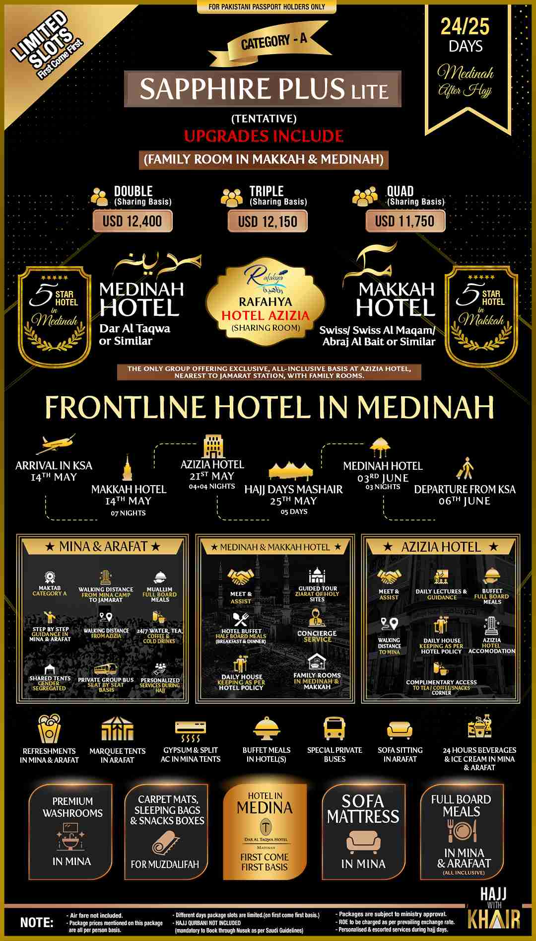 Serenity, comfort and care — the essence of Al-Khair’s Sapphire Plus Lite Hajj Package. Crafted for pilgrims who seek a balanced blend of simplicity and sophistication, this package ensures a peaceful, well-guided, and spiritually enriching Hajj journey. Experience ease and convenience with 5-star accommodations in Azizia, Makkah, and Madinah, all thoughtfully selected for their comfort and proximity to the holy sites. Enjoy smooth transportation, daily buffet meals, and round-the-clock refreshments, allowing you to focus entirely on your worship without worry. From visa arrangements to personalized on-ground support, every element is handled with Al-Khair’s hallmark precision and dedication. With a legacy built on trust, excellence, and heartfelt service, Al-Khair ensures your sacred journey unfolds with grace and ease. Reserve your Sapphire Plus Lite Hajj Package today and take the next step toward a truly fulfilling Hajj 2026 experience.