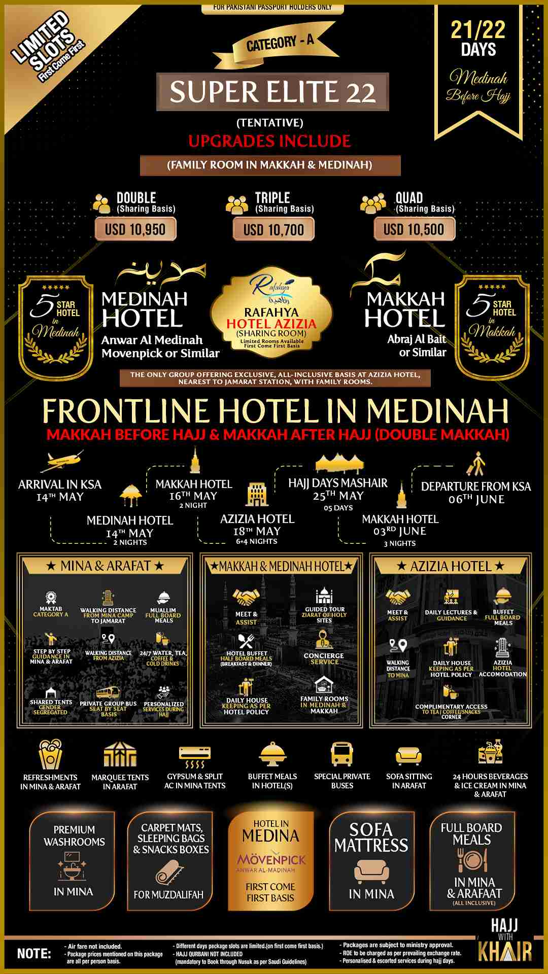 Experience a pilgrimage like no other with Al-Khair Premium 22 Plus Hajj Package, designed to provide the perfect balance of comfort, convenience and spiritual fulfillment. This package ensures that every element of your journey is taken care of, allowing you to focus solely on your ibadah without any worries. Enjoy exclusive 5-star accommodations in Makkah and Madinah, offering prime locations near the holy sites for easy access. During the sacred days of Hajj, reside in premium air-conditioned Maktab A tents in Mina, carefully arranged to provide a peaceful and comfortable setting close to the essential rituals. Travel with ease through VIP transportation services, ensuring a smooth and stress-free journey between locations. With expert scholars guiding you throughout, you’ll gain deeper insights and spiritual support at every stage of your pilgrimage. Our dedicated 24/7 assistance team is always available, ensuring your comfort, safety, and convenience throughout your journey. Limited slots available—reserve now for a truly elevated Hajj experience!