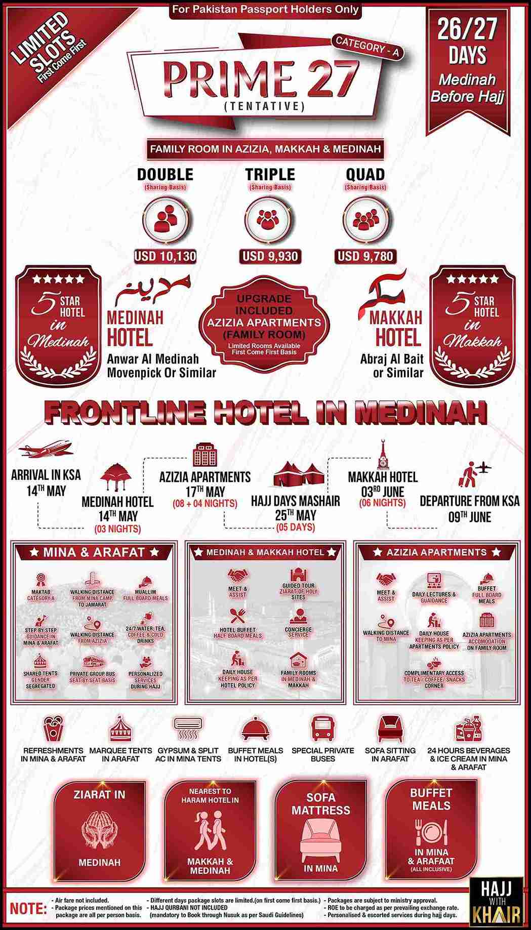 Experience the perfect balance of luxury, comfort, and convenience with the Al-Khair Prime 27 Hajj Package. Enjoy premium 5-star accommodations in Makkah and Medina, along with exclusive Maktab A category tents in Mina. Savor buffet meals at every stage of your journey, ensuring comfort throughout your pilgrimage. Our expert team handles every detail, from seamless transportation to on-site guidance, so you can focus on your spiritual journey. With years of experience, Al-Khair ensures a smooth, peaceful, and enriching Hajj. Book now for a once-in-a-lifetime pilgrimage experience. Limited slots available!