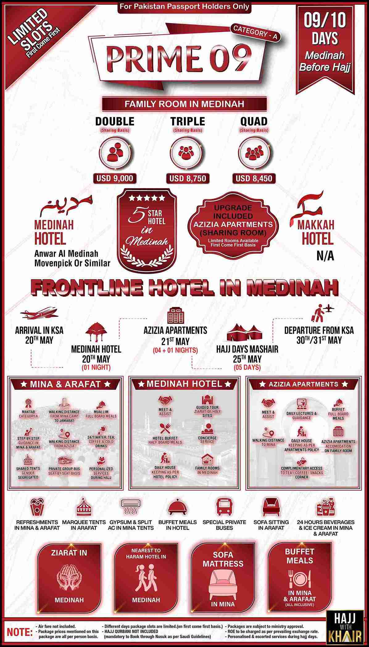 Experience a Hajj journey that combines comfort, convenience, and spiritual focus with the Al-Khair Prime 09 Hajj Package. Designed for pilgrims who wish to perform Hajj with peace of mind, this package ensures every step is carefully planned and managed. Begin your journey in Madinah, with a comfortable 5-star stay close to the Prophet’s Mosque, allowing you to connect deeply with your faith and rituals. Continue to Mina, where you’ll stay in exclusive Maktab A category tents, offering a secure, well-equipped and serene environment during the most profound moments of Hajj. At Arafat, experience a day of deep devotion and reflection, guided with care and support from our dedicated Al-Khair team. Travel effortlessly with well-coordinated transportation services, ensuring smooth transfers between the holy sites. Enjoy freshly prepared buffet meals and refreshments throughout your journey, keeping you energized and comfortable. From visa processing to on-ground assistance, our experienced team takes care of every detail, giving you the freedom to focus entirely on your worship and spiritual reflection. Limited seats available! Book your place for Hajj 2026 with Al-Khair today!