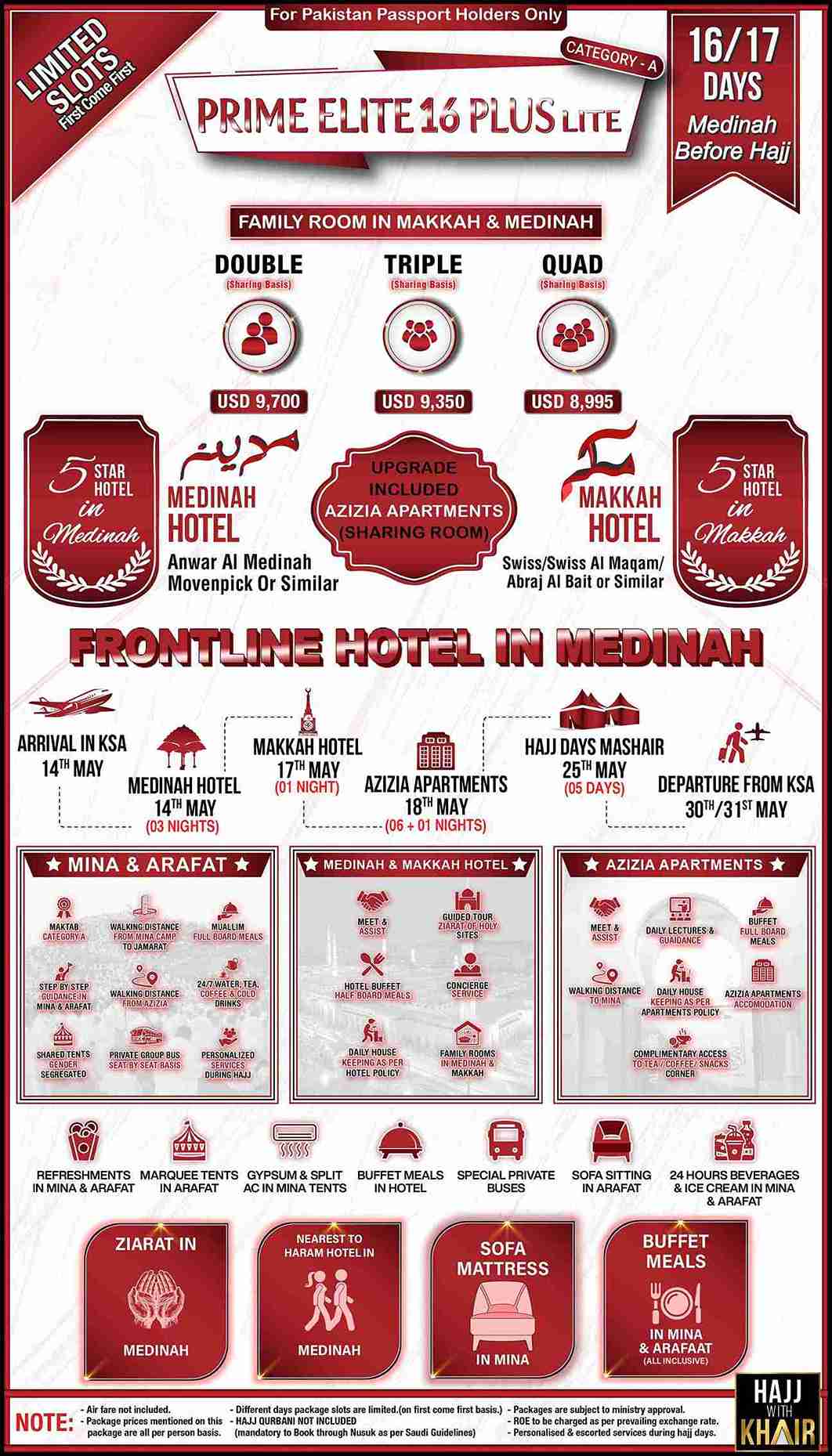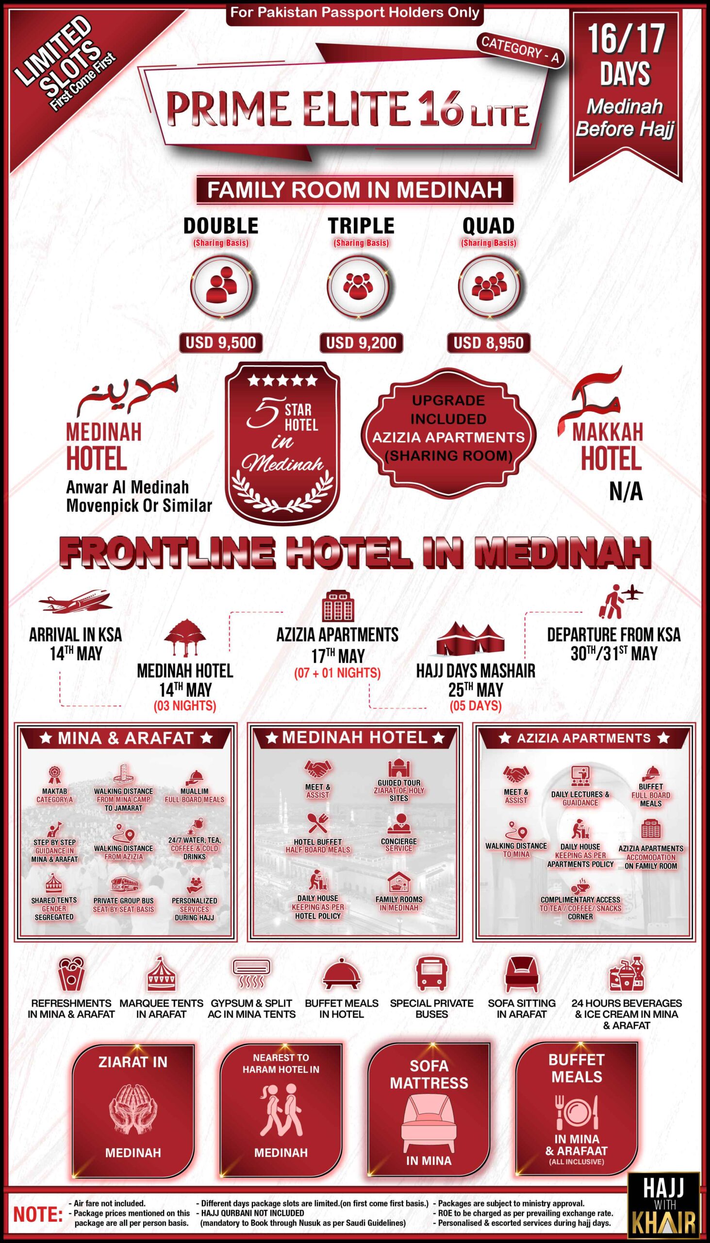 Experience a spiritually fulfilling and seamlessly managed pilgrimage with the Al-Khair Prime Elite 16 Plus Lite Hajj Package. Thoughtfully designed for those who value comfort, care, and devotion, this package ensures that every stage of your journey is marked by peace and purpose. Begin in Madinah, staying at a 5-star hotel just steps from Masjid al-Nabawi, where tranquility and reflection fill each moment. Continue to Makkah, with a 5-star stay located within steps of Al-Haram, allowing you to immerse yourself in worship close to the Kaaba. In Azizia, unwind in a comfortable building stay, providing convenience and rest before the sacred days of Hajj. During Mina and Arafat, stay in premium Maktab A tents, designed for comfort, safety, and serenity as you perform your rituals. From smooth transportation and buffet meals to attentive on-ground assistance, every detail is overseen with care by Al-Khair’s expert team. Choose Prime Elite 16 Plus Lite and let Al-Khair make your Hajj 2026 journey one of ease, reflection, and heartfelt devotion. Limited slots, book with Al.Khair today!