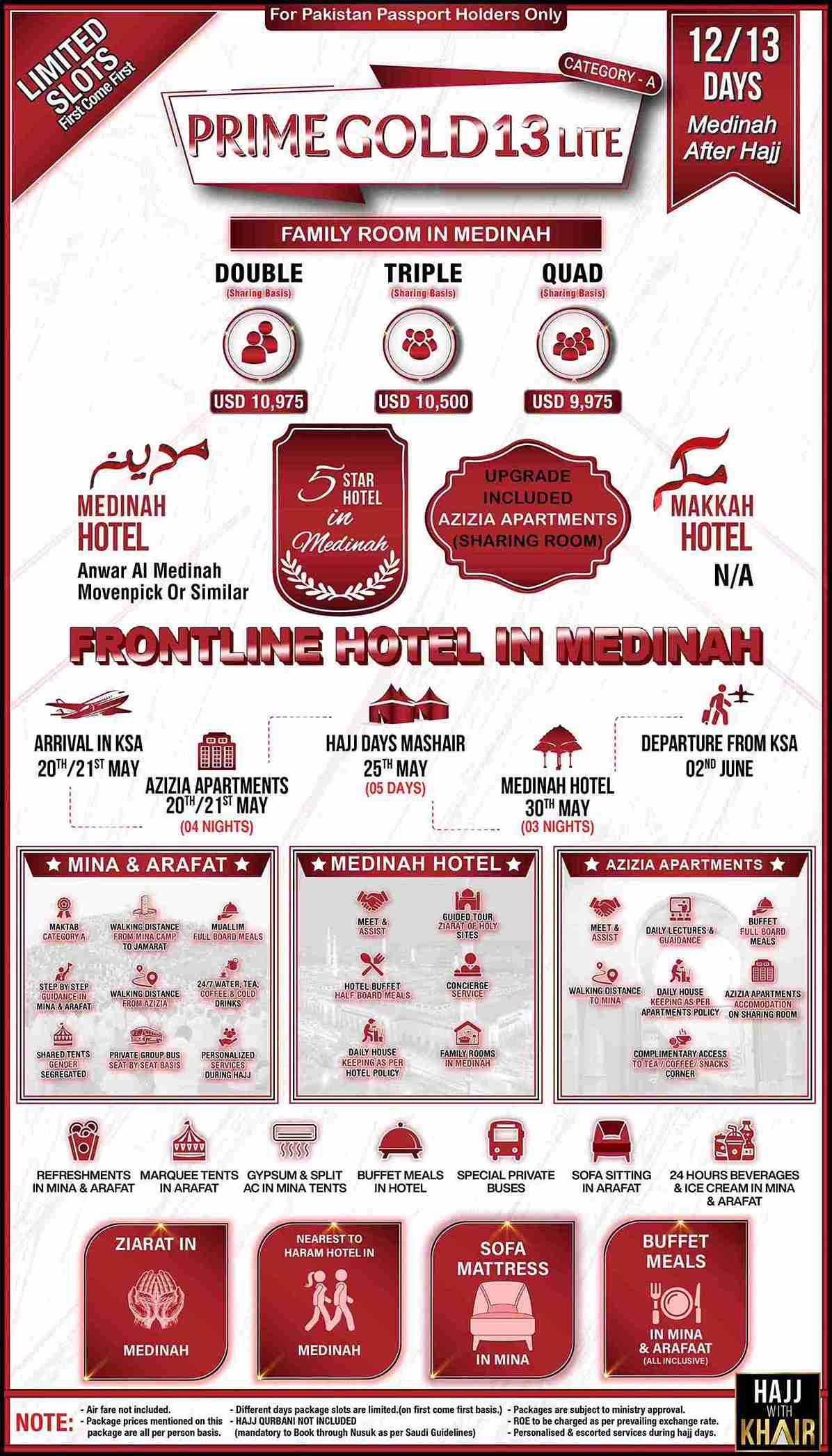 Embark on a luxurious and spiritually enriching pilgrimage with Al-Khair’s Prime 13 Pro Lite Hajj Package. Designed for discerning pilgrims who seek seamless service, premium accommodations and expert guidance, this package ensures a hassle-free and fulfilling Hajj experience. Stay in top-tier 5-star hotels in Madinah, offering exceptional hospitality and prime access to the holy sites. Experience unparalleled comfort in Maktab A category tents in Mina, equipped with air-conditioning, high-quality amenities, and dedicated services to enhance your pilgrimage. Enjoy buffet meals, VIP transportation, and well-coordinated logistics, ensuring a smooth journey from arrival to departure. Our dedicated team, expert scholars, and 24/7 support staff provide comprehensive guidance and assistance, allowing you to perform each ritual with clarity, devotion, and ease. At Al-Khair, we are committed to excellence, offering a meticulously planned Hajj experience that combines comfort, reliability, and spiritual depth. Let us handle every detail while you focus on the sacred essence of your pilgrimage. Limited slots available – Reserve today!