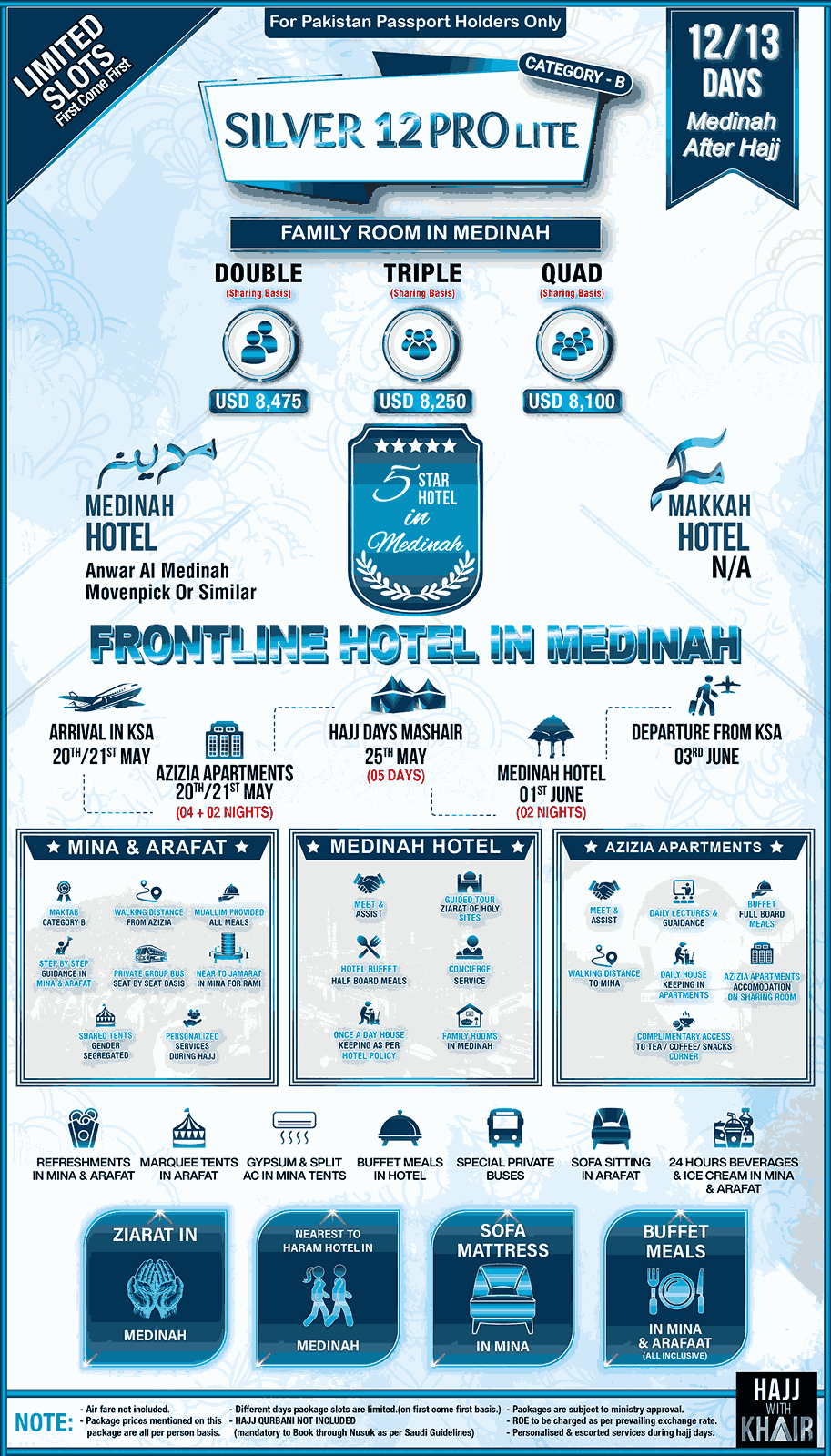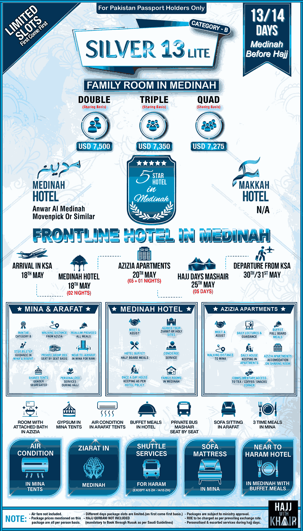 Al-Khair Silver 13 Lite Hajj Package combines luxury, comfort and exceptional value to make your pilgrimage a truly meaningful and memorable experience. At Al-Khair, we treat every pilgrim like family, ensuring unwavering support and care throughout your journey. From seamless logistics to peace of mind, our dedicated team takes care of every detail, allowing you to focus on the sacred rituals of Hajj. Stay in VIP accommodations Medina and experience the comfort of air-conditioned tents at Maktab B Mina. Every aspect of our service is designed to provide unparalleled convenience and tranquility. Choose Al-Khair’s Silver 13 Lite Hajj Package and let us guide you through this once-in-a-lifetime spiritual journey. Limited slots are available—secure your place today and make your Hajj truly unforgettable.
