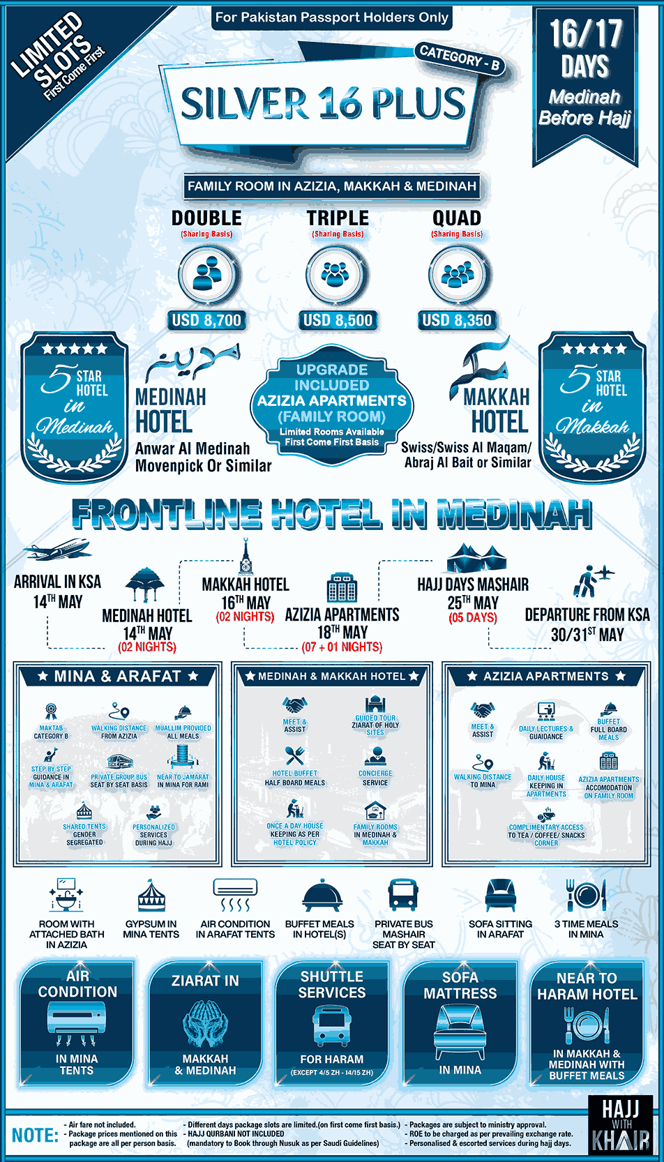Al-Khair Silver 16 Plus Hajj Package is your perfect companion for a stress-free and spiritually fulfilling pilgrimage. With a focus on comfort, care and convenience, this package is designed to meet the highest standards of service. Enjoy premium accommodations in Makkah and Medina, along with air-conditioned tents at Mina, ensuring an experience that is both comfortable and enriching. Our team of experts handles every detail, from travel arrangements to on-ground support, so you can concentrate on the essence of Hajj. Make your Hajj journey extraordinary with our Silver 16 Plus Hajj Package. Book now to secure your place in this transformative spiritual experience.