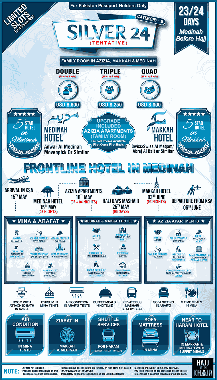 Al-Khair Silver 21 Hajj Package offers a seamless and enriching pilgrimage experience, combining comfort, organization, and expert guidance to ensure a smooth journey. Every detail is carefully managed, allowing you to focus entirely on your spiritual devotion. Enjoy luxurious stays in premium hotels in Makkah and Madinah, providing top-tier comfort and easy access to the holy sites. Experience the convenience of air-conditioned tents at Maktab B Mina, along with VIP transportation and a structured itinerary designed for a hassle-free pilgrimage. With round-the-clock support, our dedicated team ensures smooth visa processing, well-organized logistics and expert-led rituals. Whether it’s transportation, accommodations or spiritual guidance, we handle everything with precision and care. Choose Al-Khair for a memorable and deeply rewarding Hajj experience, where comfort meets devotion. Limited slots available – Reserve your spot now for Hajj 2026!